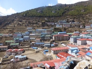 Our first glimpse of Everest was on the climb up from Monjo to Namche Bazaar, the Sherpa capital and a thronging centre of outdoor shops and coffee shops laid out on the mountainside in blue-roofed tiers. Our eyes goggled and our cameras clicked as we peered at the classic pyramid summit, topped with a plume of cloud like steam from a kettle. Below the peak the infamous Lhotse ridge was etched in snow like the icing on a cake. Over the following days we were rewarded with more views, each time the huge mass of rock appearing slightly closer. Eagles and buzzards whirl around us, coasting on thermals like surfers catching the perfect wave. When Everest was hiding coyly, we drank in the spectacle of other mountains like the bulky Ama Dablam, Mera Peak and Nuptse. Along with the thin air, the beautiful visual assault gives you a heady, almost drunk feeling. At every turn the vista seems to surpass itself and the views of these glorious peaks dipped in early morning sunlight which awaits us most mornings when we fling back our curtains makes up for the freezing rooms inside. Our path will take us onward and upward, with more views to marvel at yet to come. So long as we can keep the altitude sickness at bay, nothing can keep us from Everest Base Camp!
