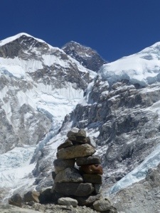 Above about 4000m an altitude headache seems to lurk perpetually at the edges of your brain, the pain almost-present even if it’s not quite making itself known at any particular momement. In the piercing cold of the lodges, this can drag you down. Yet out on the trail, the captivating vistas eclipse any discomfort. As we approached our goal, Everest Base Camp, the landscape changed from an almost Alpine scenery, albeit on a larger scale, to a barren, violent moonscape.Frilled ridges of ice soar up out of an uncompromising valley floor, on which tonnes of grey rubble have been dumped by an historic glacier, leaving a textbook landscape of moraines, U-shaped valleys and erratics. The environment is bleak, stripped down, yet also hauntingly beautiful, evoking an elemental response of awed joy. Looking at my surroundings made my spirit soar in response and I felt privileged to be there. Under a dazzling blue sky it’s difficult not to be buoyed up by a magnificent feeling which lifts the heart until it feels on a level with the summits stroking the sky.
