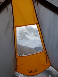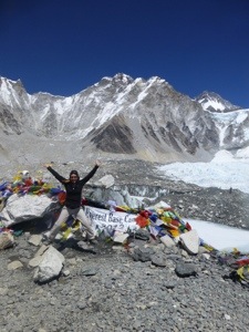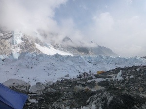Eventually we are rewarded with our first glimpse of Everest Base Camp (EBC). Tiny grapefruit yellow domes perch on the rock-strewn ice of the glacier. Behind lies the mini-mountain landscape of the notorious Khumbu Icefall, with irregular peaks like whipped eggs. This will be our home for the next three days. The camp is dwarfed by the peaks stretching their arms above and by the serrated glacier spilling out in front. Above everything is stretched the impossibly blue basin of the sky, a rich cornflower blue glowing with vitality. When we finally arrive at the canvas sign flapping in the breeze to mark the entrance to EBC it is an emotional moment. Hot tears spill in the cold air. We embrace, marvel, snap photos and then wend our weary way down the icy path to find the Xtreme Everest headquarters, delighted to have arrived, yet in the moment, scarcely able to comprehend it.